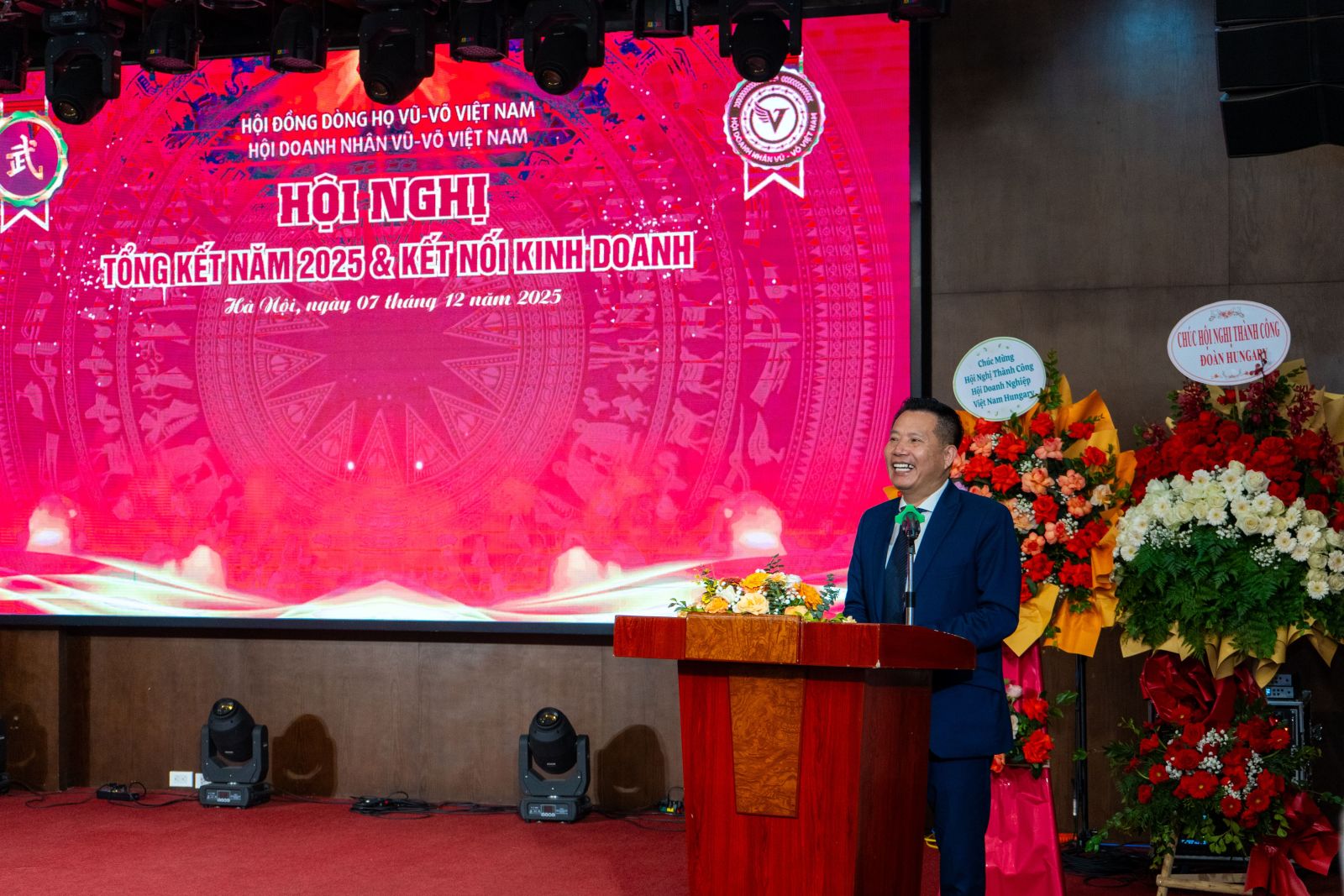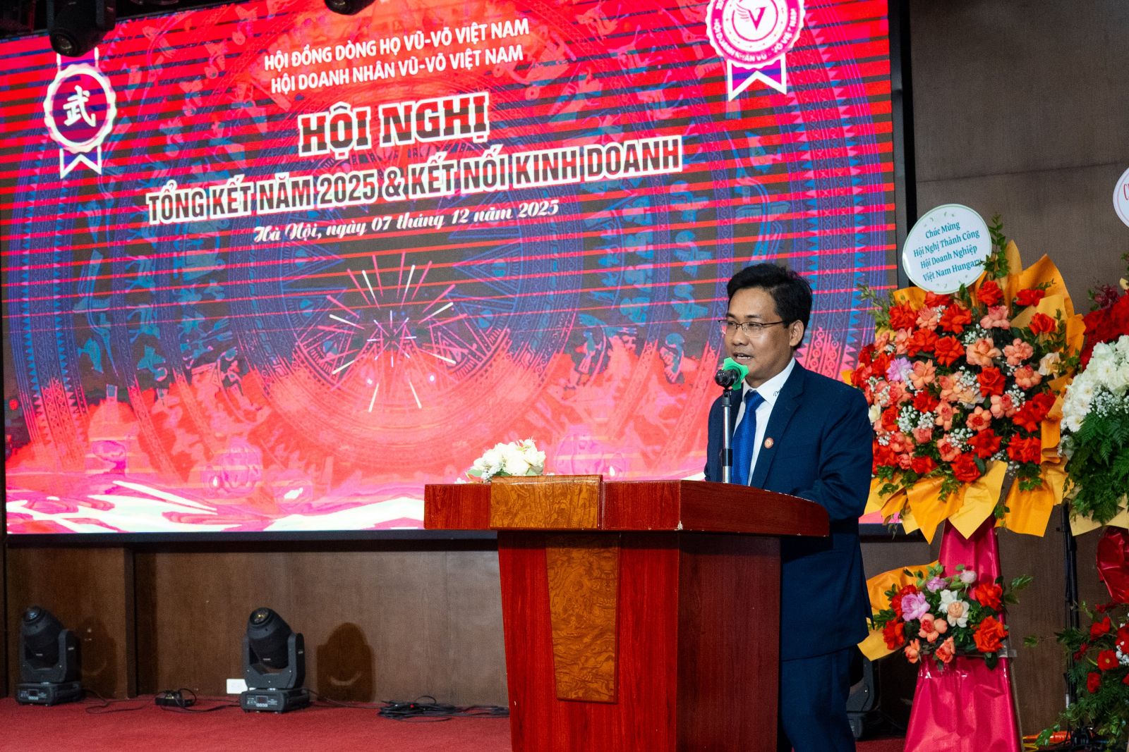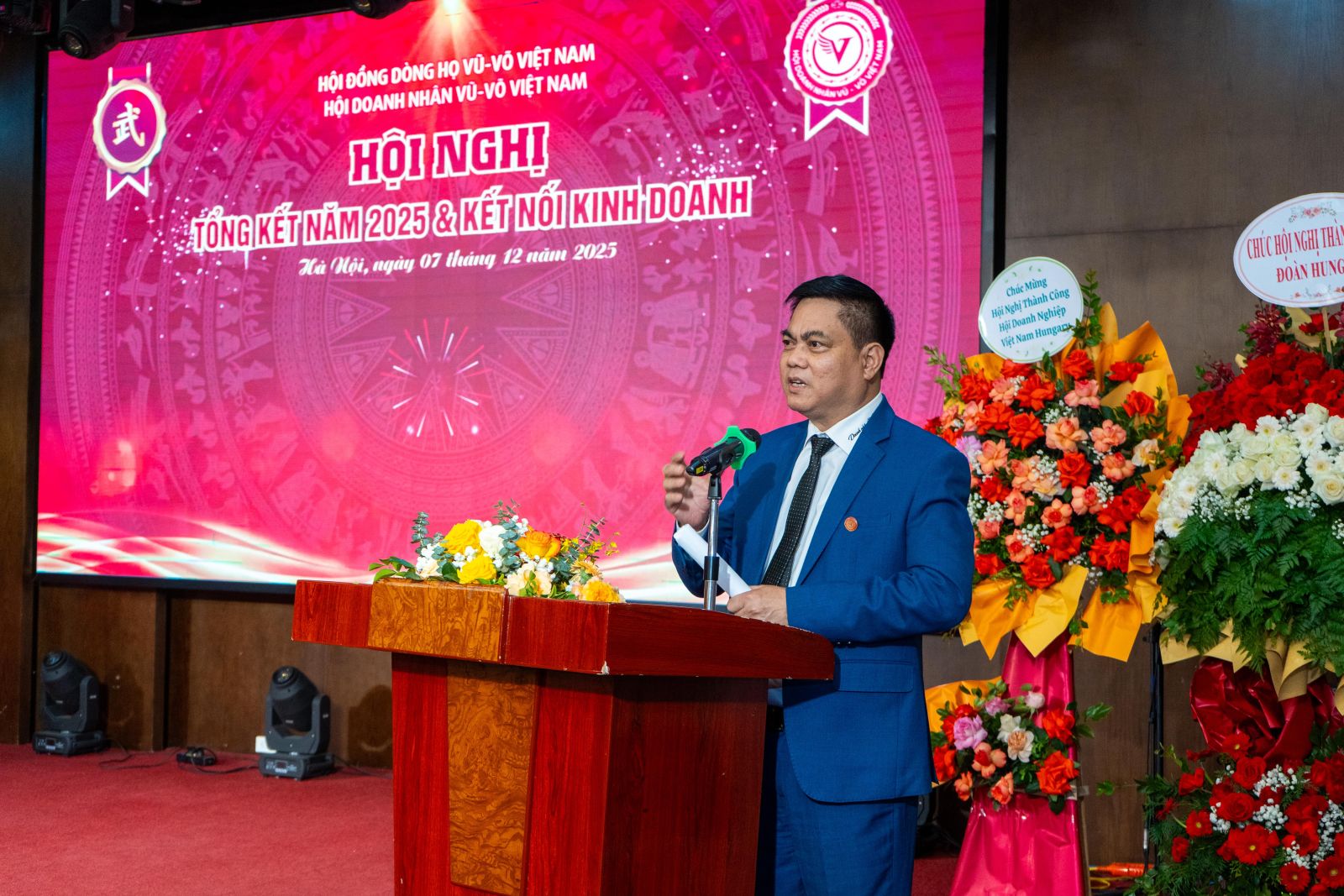 Trong phát biểu khai mạc Hội nghị Tổng kết năm 2025 và Kết nối Thương mại, Chủ tịch Vũ Văn Hậu nhấn mạnh ý nghĩa hội tụ của Hội doanh nhân họ Vũ – Võ Việt Nam. Ông đã điểm lại dấu mốc quan trọng khi Hội chuyển từ Câu lạc bộ thành Hội Doanh nhân Vũ – Võ Việt Nam, khẳng định tầm nhìn mới và trách nhiệm lớn hơn trong giai đoạn phát triển tiếp theo. Chủ tịch ghi nhận ba giá trị cốt lõi đã tạo nên sức mạnh của Hội trong năm qua: Trí tuệ từ định hướng chiến lược của Ban Cố vấn; hành động thể hiện qua việc thành lập Công ty Cổ phần đầu tư Vũ – Võ; và đạo lý được thể hiện trong các hoạt động tri ân cội nguồn. Ông nhắc lại chỉ đạo của Hội đồng dòng họ: “Kết nối phải ra giá trị, doanh nhân phải làm rạng danh dòng tộc”, đồng thời kêu gọi bước vào năm 2026 với tinh thần “Hành động – Kết nối giá trị – Vươn xa”, hướng tới xây dựng Hội doanh nhân Vũ – Võ Việt Nam chất lượng, đoàn kết và hội nhập. Kết thúc phát biểu, Chủ tịch Vũ Văn Hậu chính thức tuyên bố khai mạc Hội nghị.