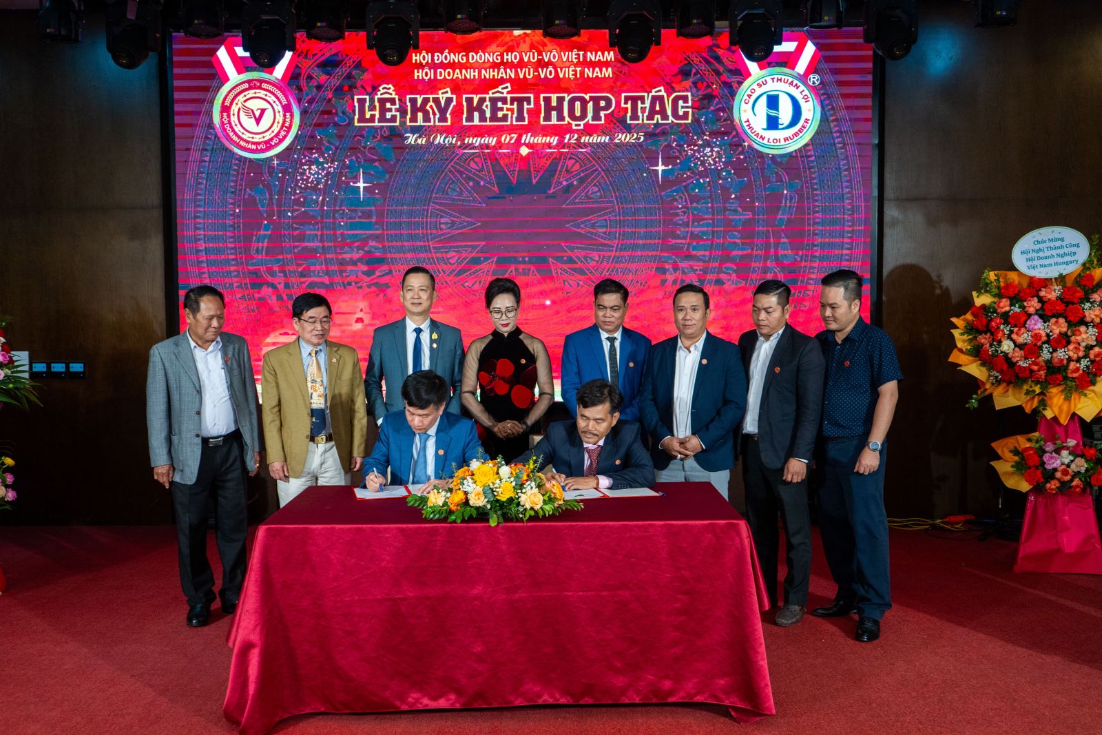 Tiếp theo chương trình, Hội Doanh nhân Vũ – Võ Việt Nam đã long trọng tổ chức Lễ ký kết hợp tác quốc tế giữa Chủ tịch Vũ Văn Hậu – đại diện Hội và ông Phạm Ngọc Chu – đại diện doanh nghiệp Hungary. Buổi ký kết có sự chứng kiến của các Phó Chủ tịch Hội cùng đoàn doanh nhân Hungary, thể hiện tinh thần hợp tác và tầm nhìn hội nhập quốc tế của Hội doanh nhân Vũ – Võ Việt Nam. Thỏa thuận hợp tác giữa hai bên tập trung vào các lĩnh vực trọng tâm: phát triển – công nghệ – thương mại – kết nối quốc tế, mở ra cơ hội thúc đẩy giao thương, chuyển giao tri thức và tăng cường liên kết giữa doanh nghiệp Vũ – Võ Việt Nam với các đối tác châu Âu.