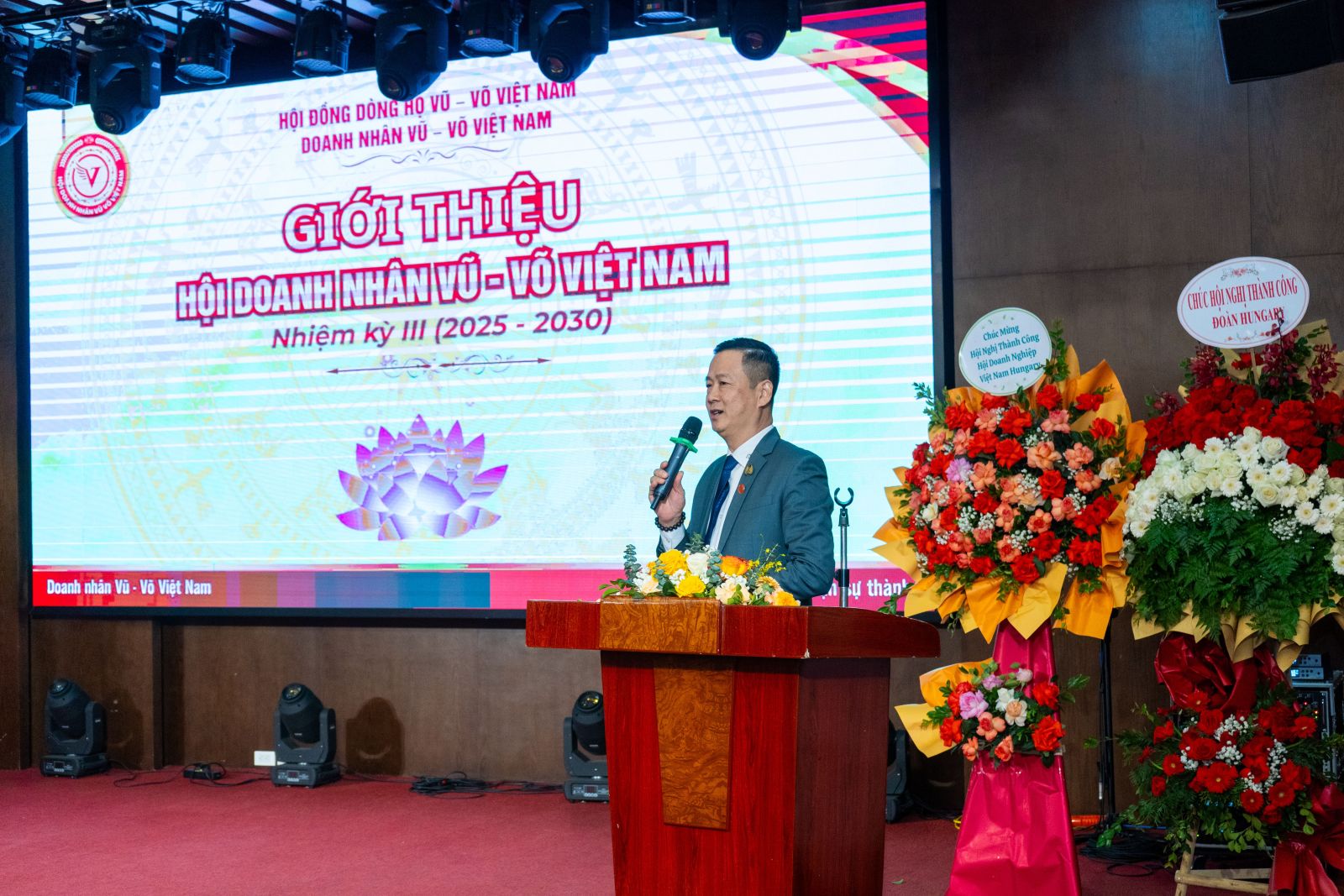 Tiếp nối chương trình, ông Vũ Hải Ninh – Phó Chủ tịch kiêm Tổng Thư ký Hội đã giới thiệu tổng quan về quá trình hình thành và phát triển của Hội Doanh nhân Vũ – Võ Việt Nam. Ông cho biết Hội được kiện toàn từ Câu lạc bộ Doanh nhân Vũ – Võ và chính thức hoạt động theo Quyết định số 18/HĐDH-2025 và 40/HĐDH-2025, đánh dấu bước trưởng thành quan trọng trong mô hình tổ chức và tầm nhìn. Hội hoạt động theo phương châm “Tu rèn – Kết nối – Phát triển – Phụng sự”, hướng tới xây dựng cộng đồng doanh nhân đoàn kết, trí tuệ và tạo giá trị thiết thực cho dòng họ. Ông cũng giới thiệu cơ cấu lãnh đạo nhiệm kỳ III (2025–2030), với vai trò dẫn dắt của Chủ tịch Vũ Văn Hậu, Ban Thường trực, Ban Chấp hành và Ban Cố vấn gồm GS.TSKH Vũ Minh Giang, GS.TS Vũ Minh Khương (Singapore) cùng các chuyên gia uy tín. Bên cạnh đó, ông nêu mục tiêu trọng tâm, trong đó có kế hoạch đến năm 2030 phát triển 500 hội viên ưu tú và hoàn thiện hệ thống hoạt động trên toàn quốc.