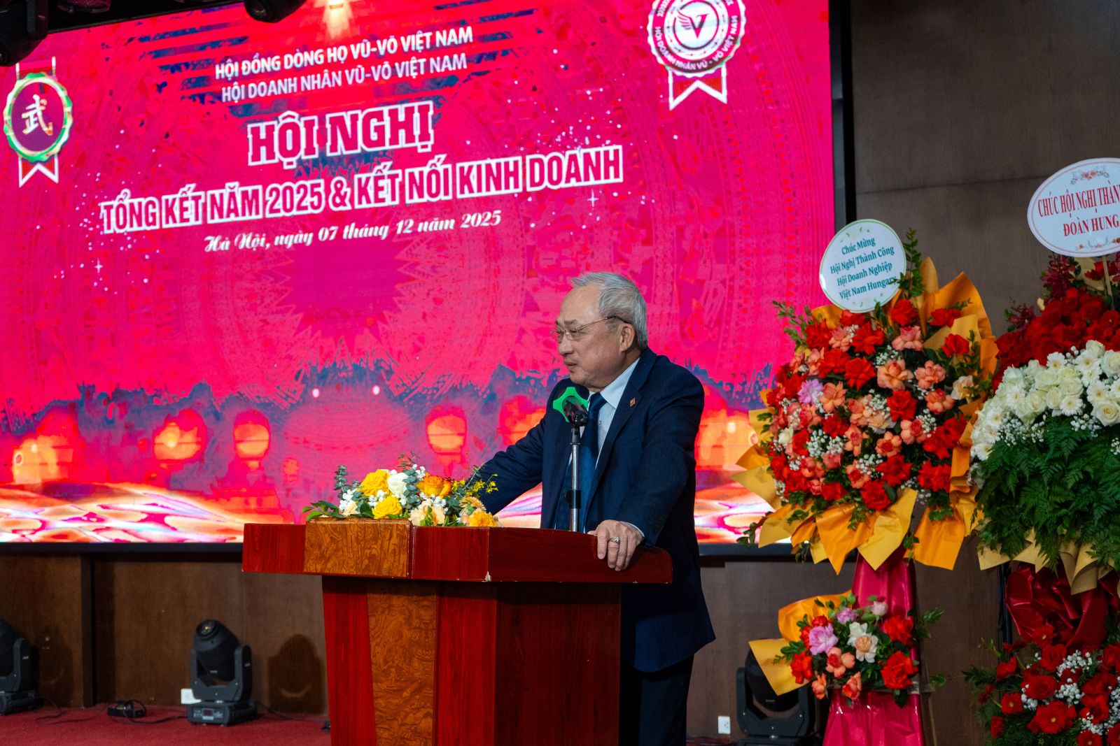 Trong phát biểu chỉ đạo tại Hội nghị, Thượng tướng, GS.TS Vũ Văn Thành ghi nhận sự trưởng thành và tinh thần đoàn kết của Hội Doanh nhân Vũ – Võ trong năm 2025, đồng thời khẳng định doanh nhân là lực lượng nòng cốt đóng góp cho sức mạnh kinh tế của dòng họ và đất nước. Ông đề cao văn hóa “tương thân tương ái”, yêu cầu doanh nhân không ngừng học tập, đặc biệt là nâng cao năng lực ngoại ngữ để đủ khả năng hội nhập và mở rộng hợp tác quốc tế. Từ kinh nghiệm nhiều năm trải qua nhiều chức vụ cao cấp và từng giảng dạy ở nước ngoài, ông nhấn mạnh rằng không có ngoại ngữ, doanh nghiệp khó vươn ra thị trường toàn cầu. Thượng tướng cũng yêu cầu cộng đồng doanh nhân thượng tôn pháp luật, ứng dụng công nghệ thông tin – chuyển đổi số – tư duy đổi mới, coi đây là nền tảng nâng cao năng lực cạnh tranh. Theo ông, doanh nhân Vũ – Võ muốn thành công phải hội tụ đủ “Đạo đức – Trí tuệ – Công nghệ”. Ông bày tỏ tin tưởng tinh thần đoàn kết và khát vọng đổi mới sẽ giúp cộng đồng doanh nhân Vũ – Võ tiếp tục vươn xa và làm rạng danh truyền thống dòng họ.