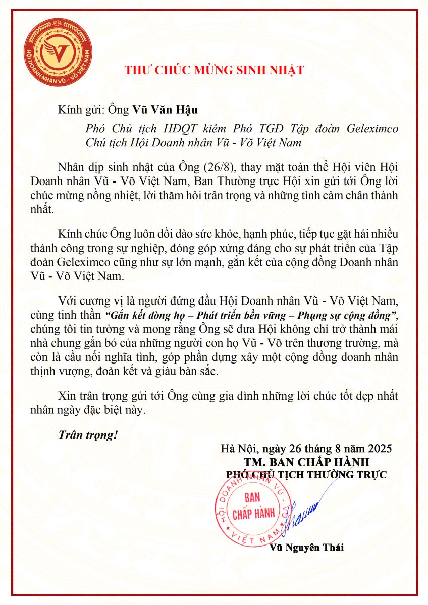 Ban Chấp hành Hội Doanh nhân Vũ - Võ Việt Nam đã đến tặng hoa, gửi lời chúc mừng sinh nhật tới Chủ tịch Vũ Văn Hậu; buổi gặp gỡ diễn ra trong không khí ấm áp, thân tình, thể hiện sự gắn kết và nghĩa tình của cộng đồng Doanh nhân Vũ - Võ Việt Nam.